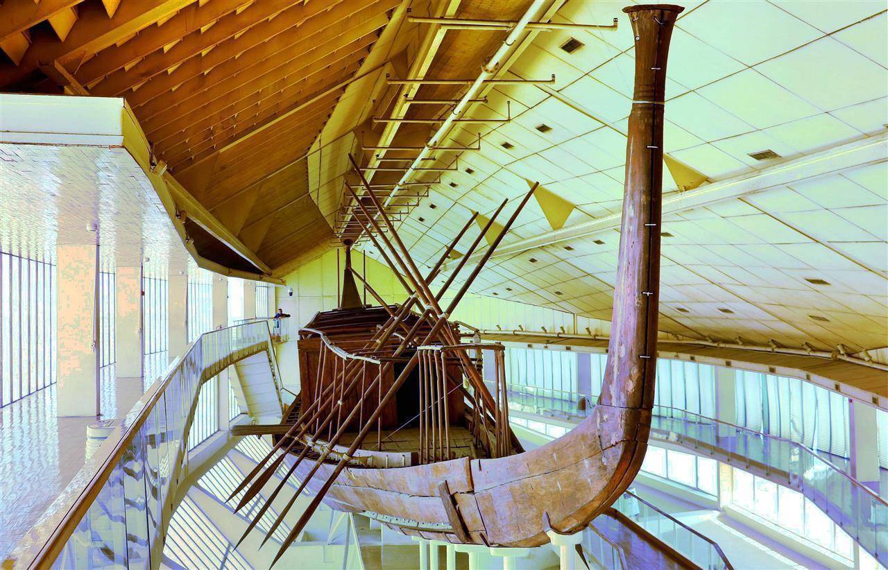 博物馆与著名的吉萨金字塔群“遥遥相望”,游客在馆内透过玻璃幕墙便能清晰望见远处的金字塔。